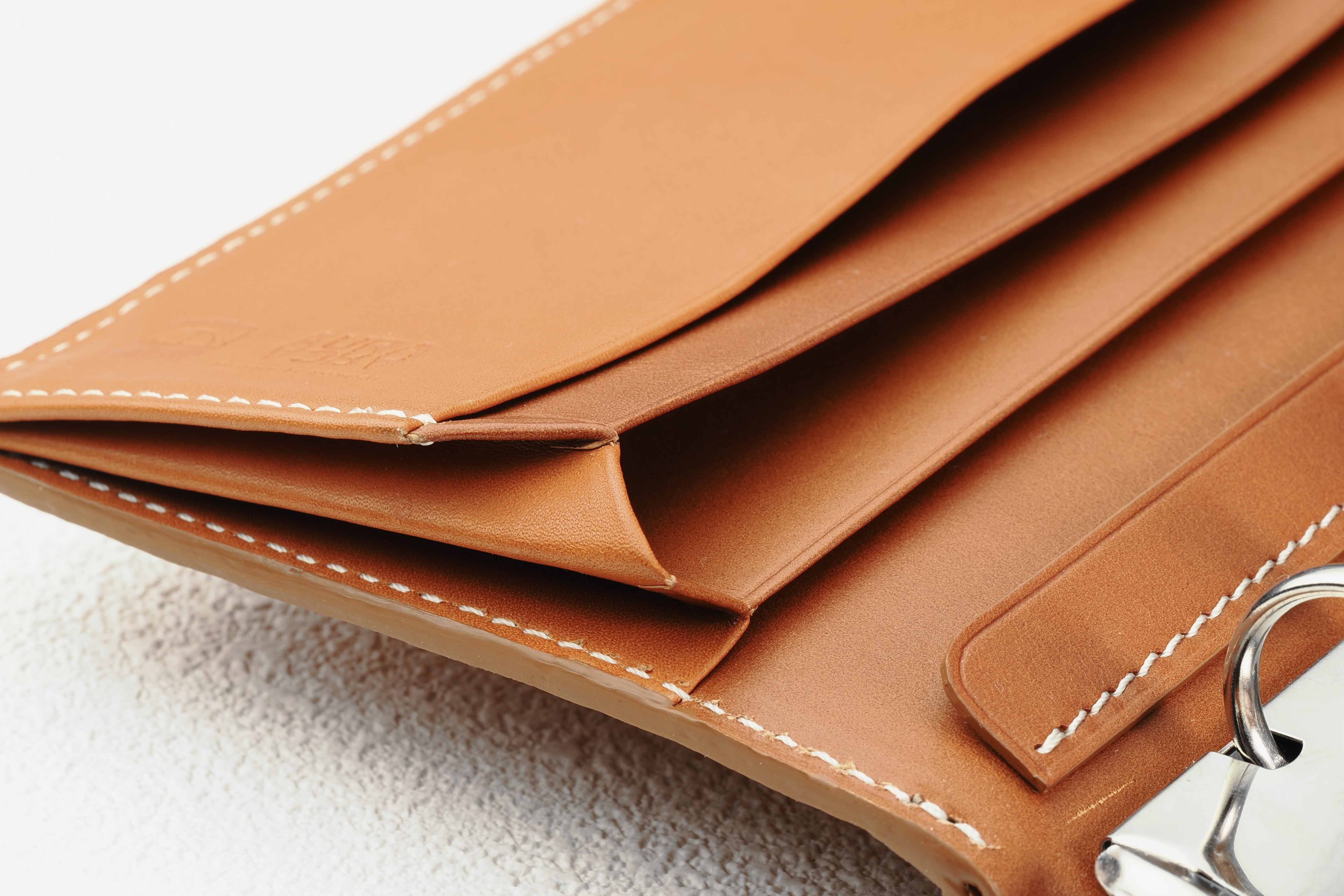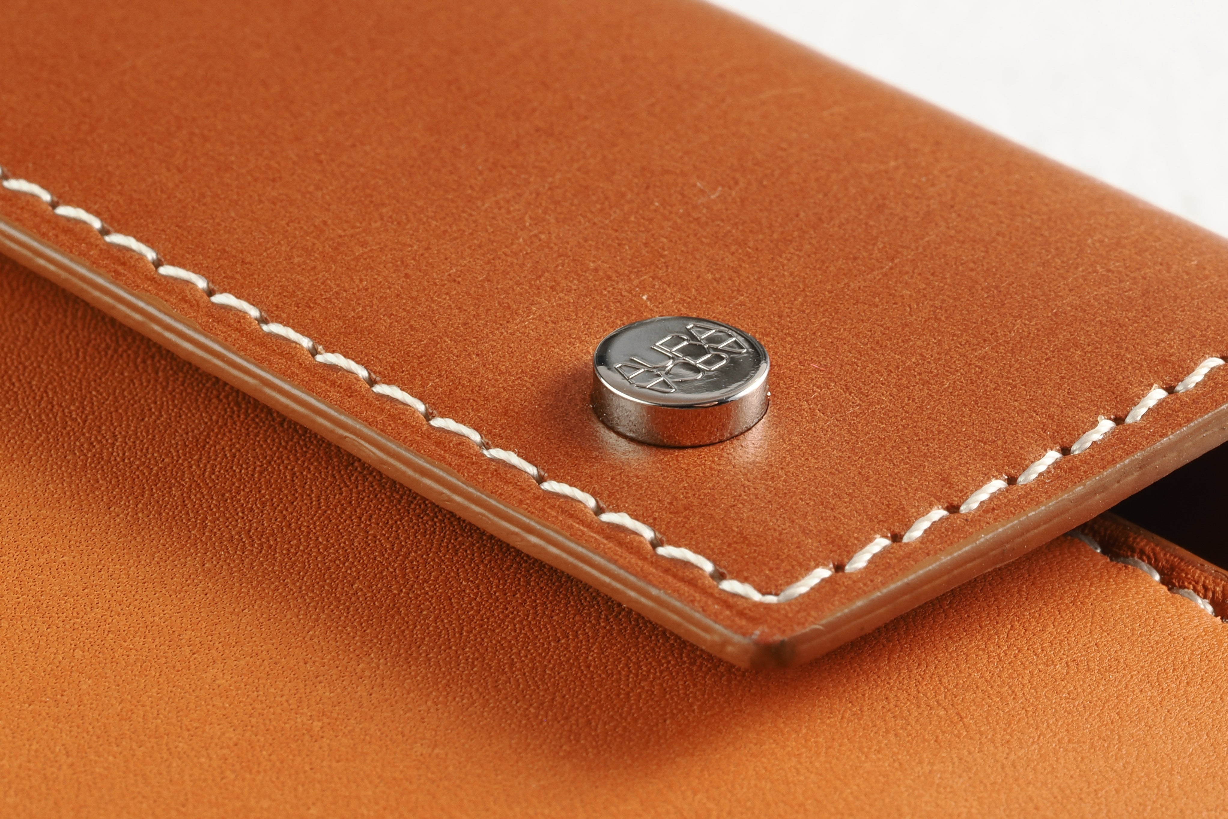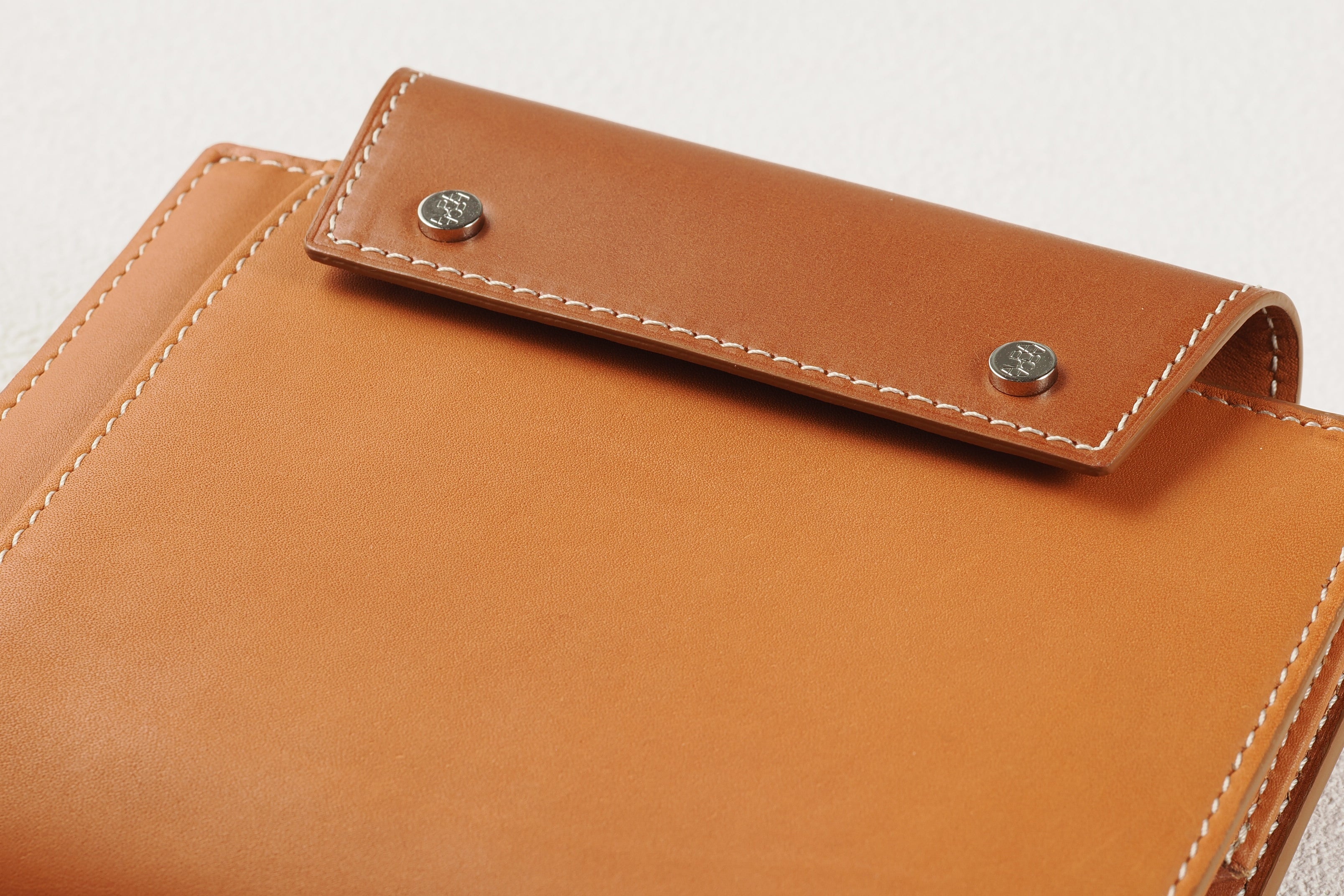 直径7mmの特注ホックは、一度大きく打ち抜いた金具を再度小さく打ち抜くという手の込んだ作り。ロゴの刻印は伝統ある「やげん(薬研)彫り」を採用。断面の形をV字形に彫るので、文字はシャープに浮き立ち、使い込んでも際立ったロゴの明快さが持続します。